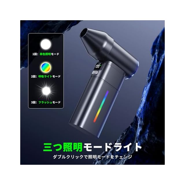 【5+1段階風量風量調整・3モードLEDライト】 エアダスターは前方ボタンと後方ボタン、5+1段階風量があります。前方ボタンは長押し不要で、5段階風量調整できます。一回ずつ押すと、風量をチェンジし、ディスプレイは5・25・50・75・100、5段階の風量を表示します。最低風量で約180分間連続使用可能です。後方ボタンは爆風モード、長押し必要があります。ディスプレイは199を表示し、強力な風量で、ホコリを一瞬に吹き飛ばします。手を離せば、爆風モードを停止し。また、本エアダスターは綺麗なLEDライトを装着し、単色照明モード・ランニングライトモード・フラッシュモードの三つ照明モードを調整できます。キャンプ場などのアンビエント照明に楽しみ。
