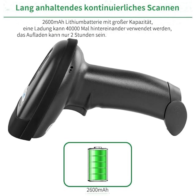 【2600mAhバッテリーアップグレード】1日に2,000回スキャンした場合、フル充電の2600mAh充電式バッテリーで30営業日使用できます。 待機時間:60日以上。 対応コード一覧:UPC/EAN/JAN、UPC-A & UPC-E、EAN-8 & EAN-13、JAN-8 & JAN-13、ISBN/ISSN、Code 39、Codabar、Code 128 & EAN 128、Code 93、ITF 2 of 5、IATAコード、MSI、中国郵便番号、Code 32、Industrial 2 of 5、Standard 2 of 5、JAP、Code 11、GS1 DataBar(QRコード複合コードを除く)、Telepen。
