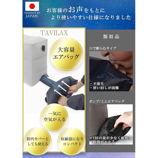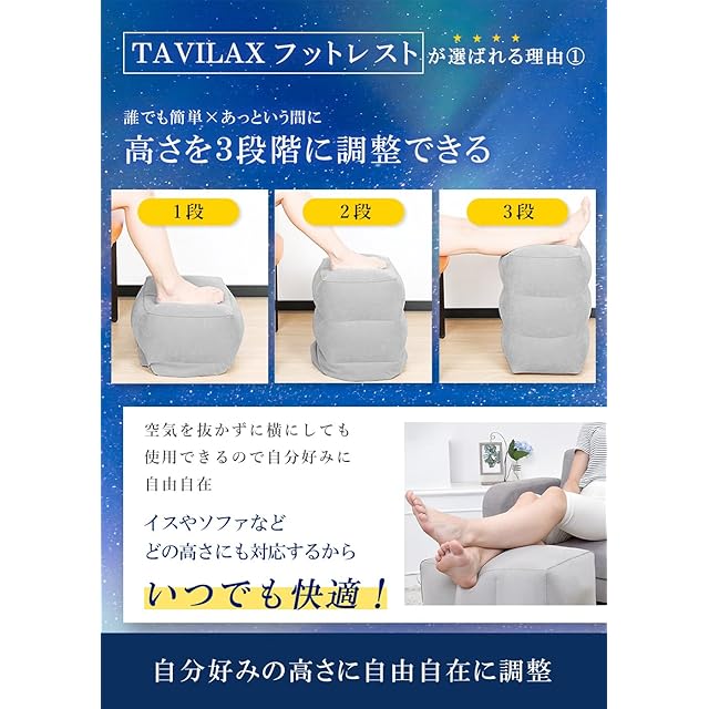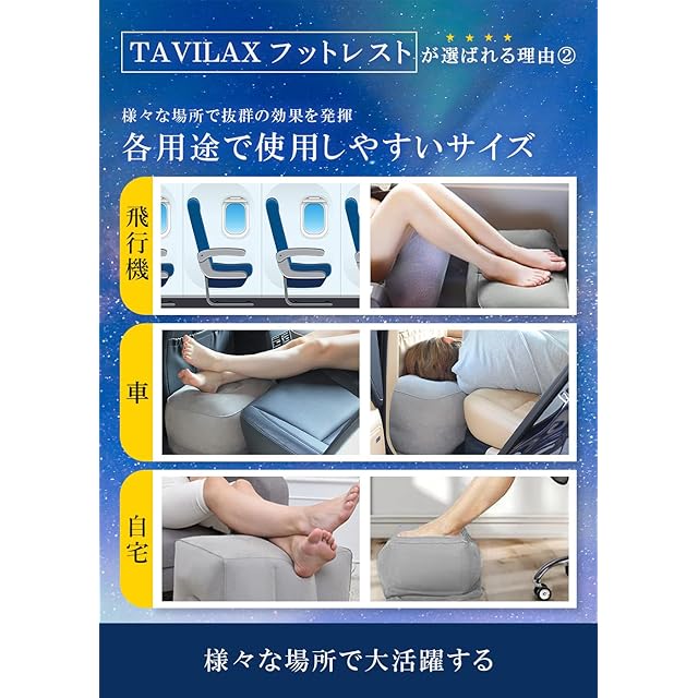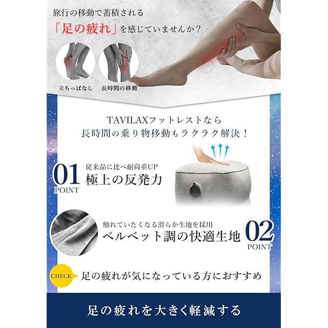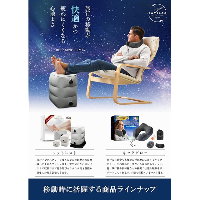 【ちょっと贅沢な移動時間】旅行や外出の移動を快適に過ごせるだけでなく、ゆとりのある姿勢を保てることで、心までリラックスし贅沢な移動時間を過ごせる足枕。TAVILAXが満を持してご提供する旅行便利グッズ。