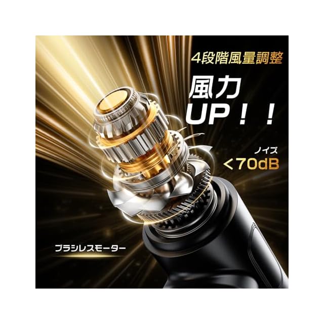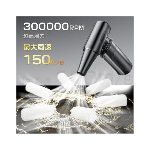 ご注意:新グレードではノズルやブラシ、収納袋を多数装備しましたので、追加購入も可能です。あまり暑い環境でのご使用にはご注意ください。発熱時は使用を一時停止した方が良いです。【風速150m/s&300,000RPM】日本業界初のダブルタービンファンで風量2倍!ブロワーはブラシレスモーターを採用し、ノイズは以前より低くなった、空気の運動エネルギーを大幅にUP!強力で効率的なエアフローを実現します。風速が弱いという問題点を解決しました。瞬間的に強い風をピンポイントで送れてホコリを吹き飛ばします。耐久性が大幅に向上するだけでなく、消費電力も30%削減できます!