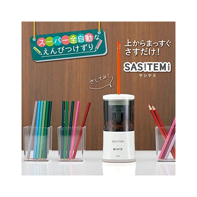 リビング学習に最適なコードレス充電式のスーパー全自動鉛筆削り。細長いスタイリッシュな形状で設置面積が小さく省スペース。