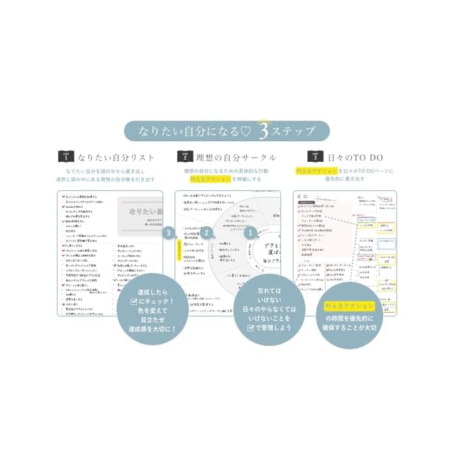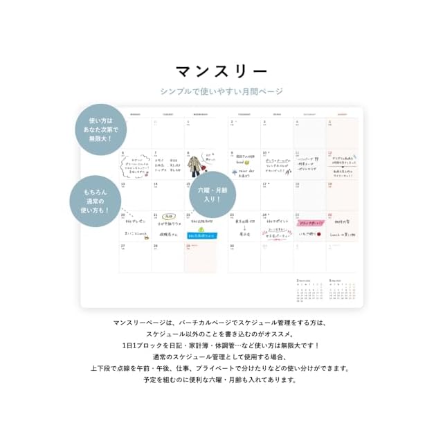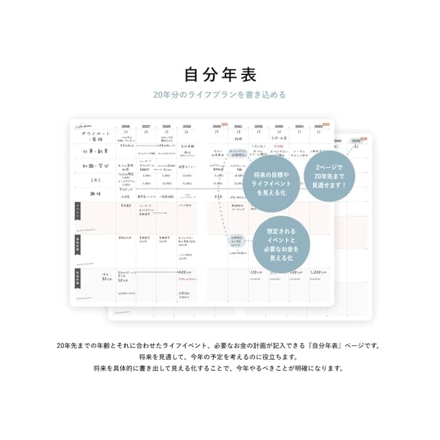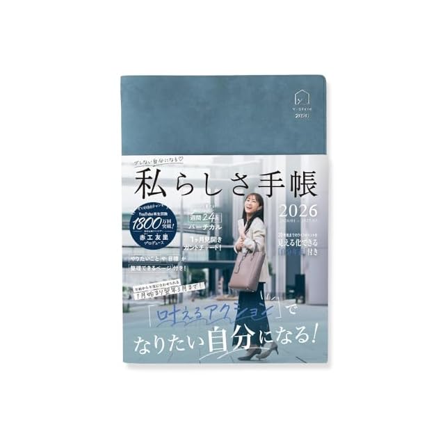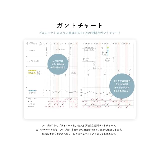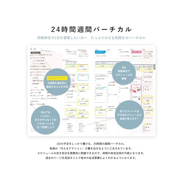 【構成内容】年間スケジュール、マンスリー(六曜あり・月齢あり)、ガントチャート、自分年表、なりたい自分リスト、理想の自分サークル、やらない事リスト、叶えるアクション欄付き24時間週間バーチカル、メモ、ペンホルダー、しおり紐3本