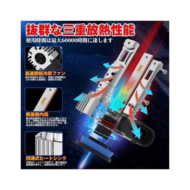 【優れた放熱システム】LEDの放熱性能は使用寿命に大きく影響します。Perrace h8 led フォグ・h11 led フォグランプは、高速回転冷却ファンを内蔵し、航空グレードのアルミニウムと、熱を効率的に逃がす凹溝式設計が採用されています。この三重の放熱システムにより、50,000時間以上の長寿命を実現しました!高温下でも優れた耐熱性と放熱性を発揮し、夏場でも安定した性能を維持します。