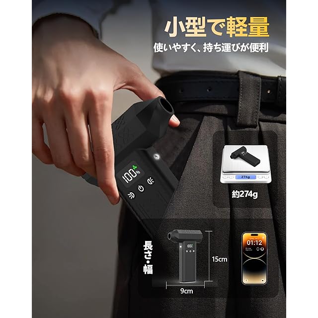 【コンパクトで操作が簡単】充電式コードレスタイプなので、コードに引っかかる心配もなく安心して使えます。電源ボタンを3秒間押してオンにし、速度を1速に設定します。電源ボタンを1回押すでとに、弱風→中風→強風→電源OFF→弱風の順に切替わります。スタンバイモードで1分間何もしない場合は、自動的にオフになりますパソコンのケース、キーボード、車、扇風機、窓などのホコリ除去に適しています。多機能ノズルは、浮き輪、ヨガボール、エアマットレスなどの膨張に使用します。余分な装飾なくシンプルなデザインとなり、洗練されたおしゃれです。