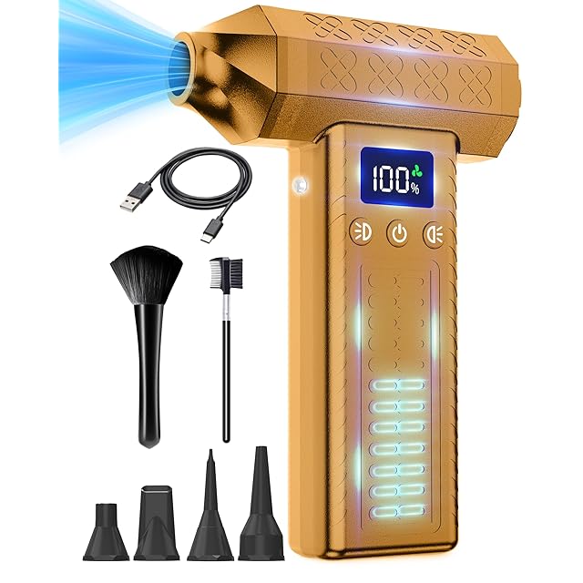 FOXKING 最強風力120m/s 洗車 ブロワー 最強 300000rpm電動エアダスター 小型ミニブロワー (3段風量調整· 8000mAh· 200分連続作業可) 充電式ブロアー 2個LEDライト付き 274g軽量 コードレス LCD数字ディスプレイ搭載 純真鍮ターボブラシレスモーター カメラ/pc/キーボード/パソコン疾風掃除 水滴飛ばし(イエロー ) | つむぎ屋
