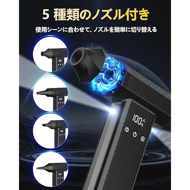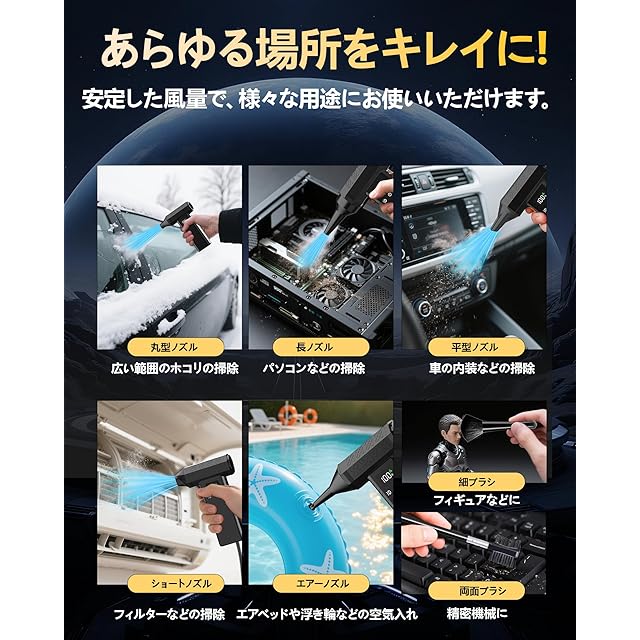 【5種類のノズル付き&高輝度LEDライト2つ搭載】使用シーンに合わせて、ノズルを簡単に切り替えて、あらゆる場所をキレイに! 丸型ノズル:広い範囲のホコリの掃除。長ノズル:パソコンなどの掃除。平型ノズル:車の内装などの掃除。ショートノズル:フィルターなどの掃除。エアーノズル:エアベッドや浮き輪などの空気入れ。細ブラシ:フィギュアなどに。両面ブラシ:精密機械に。安定した風量で、様々な用途にお使いいただけます。最新型のLED強光チップを採用し、ライトの使用寿命は10000hに達します。明るく、光が均一。両端の異なる機能にそれぞれライトを搭載、それぞれ操作でき、夜間や隅などの暗い場所でもはっきり見えてお掃除できます。