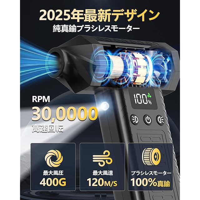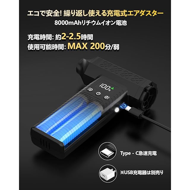 【100%真鍮超強力ブラシレスモーター&8000mAh大容量バッテリー&急速充電可能】アップグレードされた超強力モーターを採用、コンピュータやその他のデバイスの隅々からほこりを吹き飛ばすことができます。場所を選ばずどこでも簡単に使えるようになりました。8000mAhの大容量リチウムバッテリーを内蔵しており、約2-2.5時間フル充電で最大200分使用可能で、各種作業の円滑な完了を支えることができます。また、USB-C充電ポートは急速充電に対応しており、高速で効率的な充電が可能です。