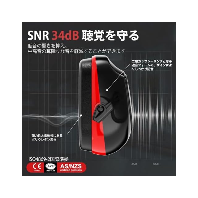 【SNR値34dB】EZRAC防音イヤーマフは、優れた遮音性能を提供し、さまざまな環境で周りの騒音を軽減します。SNR値:34dB NRR値:28dB。(完全な防音はできないため、ご注意ください)。