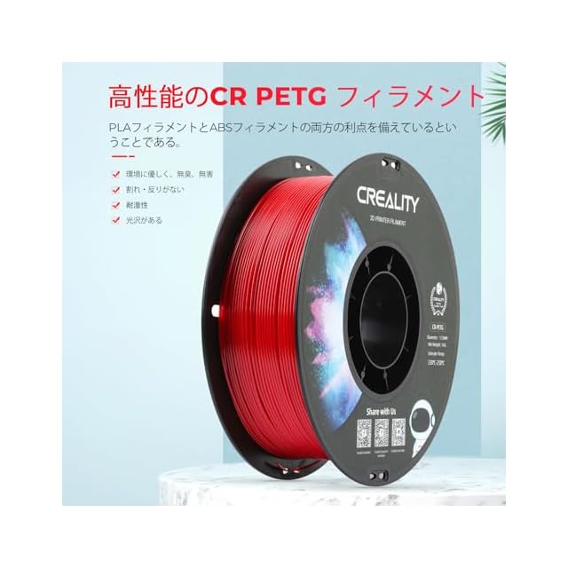 【環境にやさしい無毒素材】CR-PETG 3Dフィラメントは、耐候性、耐化学性に優れ、無臭で環境に優しい無毒性です。PETGフィラメント1.75mmは一貫した送りと安定した印刷をするための最小公差と低反り。