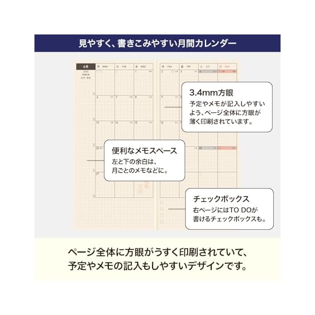 【記入欄】■月間カレンダー/ブロック式、月曜はじまり ■週間予定/レフト式