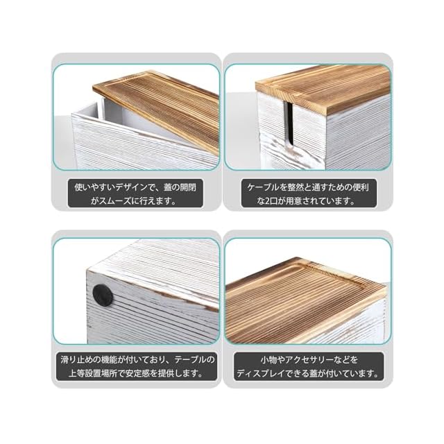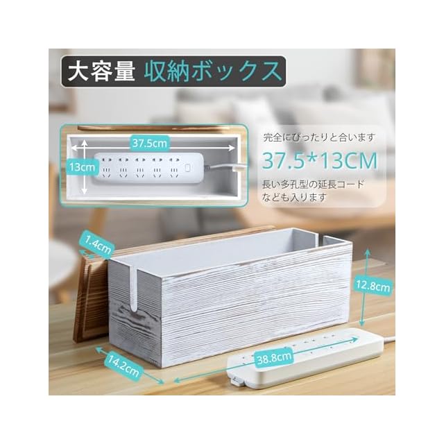 【多機能ケーブルボックス 木製デザイン】シンプルで上品な木目調オフホワイトデザインのケーブルボックス、配線隠し、コンセント隠し、ケーブル 収納、 電源タップやルーター、充電ケーブルをすっきり収納し、生活空間に調和するスタイリッシュな外観が魅力のコンセントボックスです。