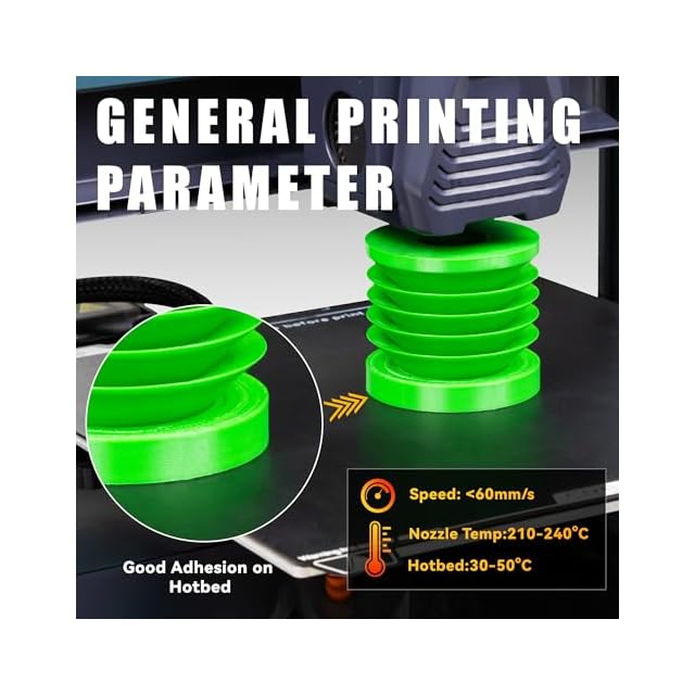 ヒント: 1. TPU 95A フィラメントは湿度に非常に敏感なので、最適な印刷性能を得るために、使用前に乾燥させ(ブラスト乾燥オーブン: 70℃、8H)、使用後は密封しておくことをお勧めします。 2. ノズル温度: 210〜240℃、ベッド温度: 30〜50℃、印刷速度 <60mm/s。印刷中および容器の湿度を 20% RH 未満に保つ(密封し、乾燥剤を使用)