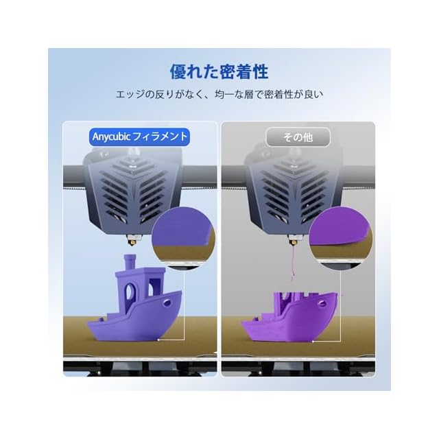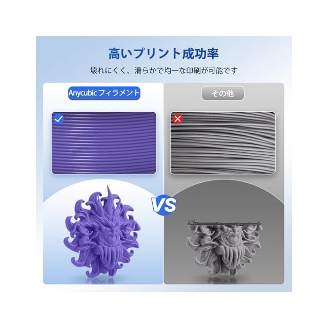 【高精度&一貫性】Anycubicの1.75mm径PLAフィラメントは、最小直径公差±0.02mmを実現。フィラメントの流出がよりスムーズで均質な仕上がりを可能にします。低収縮性と安定した印刷寸法により、層間の融合が非常に良好で、ブリッジング性能も向上。直径のばらつきによる供給速度の乱れや、層の厚さムラを心配する必要はありません。
