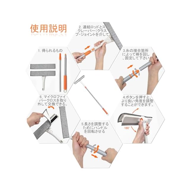 360°回転ヘッド:ボタンを押して、水キリワイパーにのヘッドを適切な角度に回転させ、放して所定の位置にロックします。そして、アーチ型の窓、梁の窓、バーモントの窓、魔女の窓を簡単に掃除することができます。