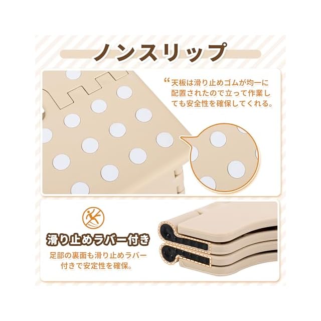 【滑り止め付き】天板の上部は滑り止めゴムが均一に配置され、足部の裏面も滑り止めラバー付き。安定性確保できる折りたたみ踏み台。