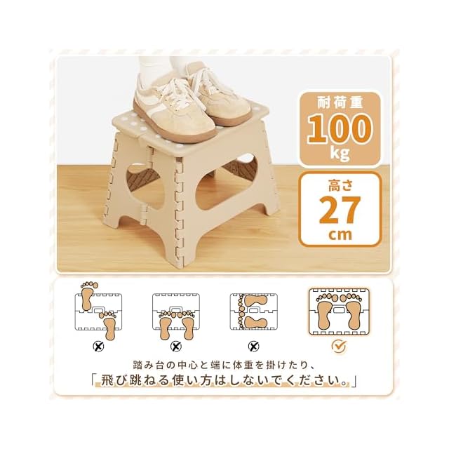 【100kgの超耐荷重】軽量ながらも頑丈な設計で、最大100kgの重量に耐えることができます。洗車やキャンプ、キッチンの高所作業など、様々なシーンで活躍してくれる頼れる踏み台です。