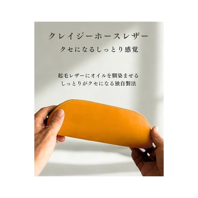 【クレイジホースレザー】他にない個性的な味わいの革を使いました。起毛レザーにオイルを馴染ませた「しっとりした」肌触りで、使うたびに五感の喜びを感じていただけます。植物性タンニンでなめしているので、使うほどに馴染み、経年変化があり、革を育てる楽しみがあります。