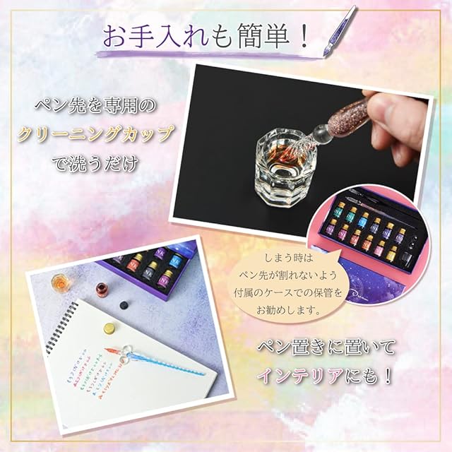 ✅【セット内容】ガラスペン2本 (18cm)、インク12色 (7ml)、ギフトボックス型ペンホルダー、クリーニングカップ