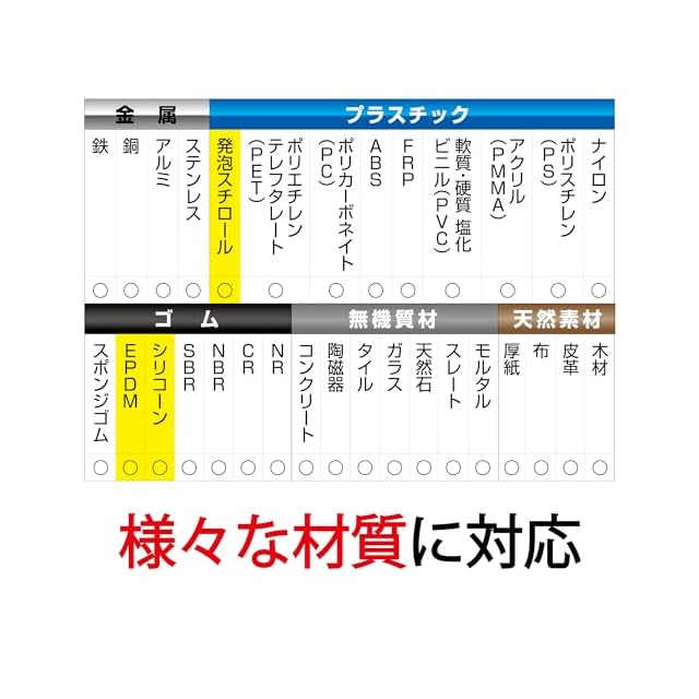 使用できるもの:金属、木材、軟質塩化ビニル、皮革・布、コンクリート・タイル、陶磁器・石材、硬質プラスチック、合成ゴム