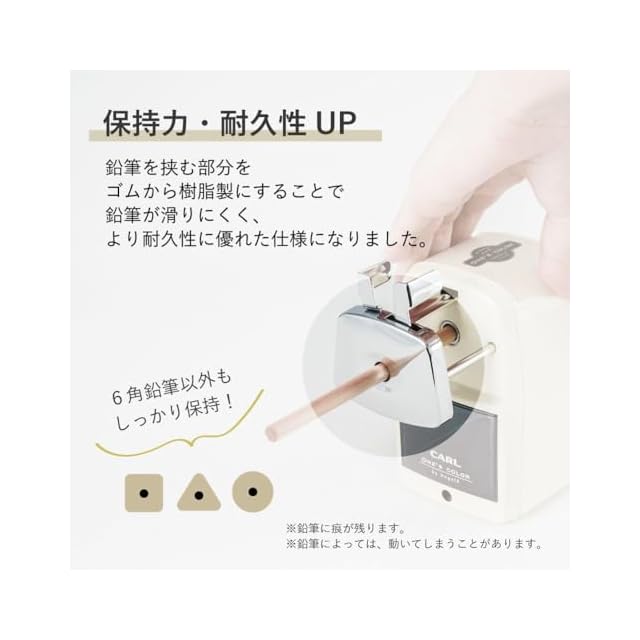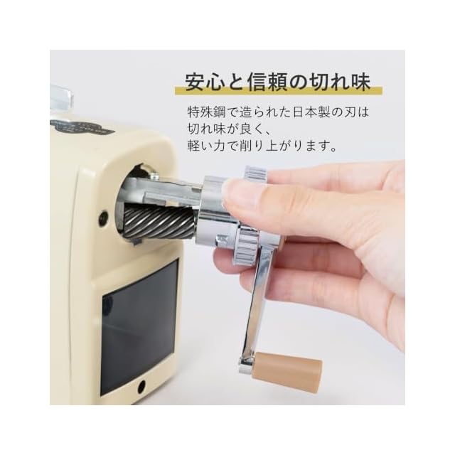 削り刃は特殊鋼で作り上げられ、精度と耐久性に優れている。シャープな切れ味を実現。鉛筆が削り上がると、ハンドルが軽くなるムダ削り防止機能付き。