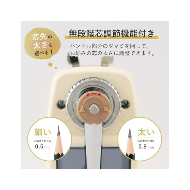 【機能】無段階新調節機能(芯の太さ目安0.5mm~0.9mm)、ムダ削り防止機能。