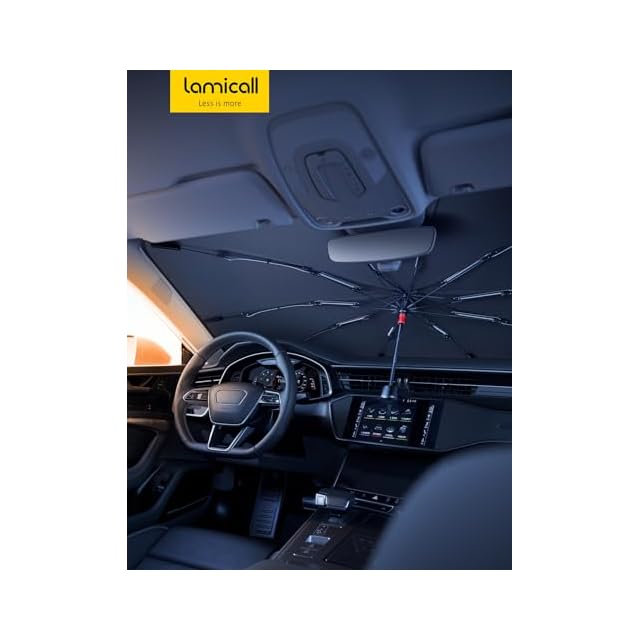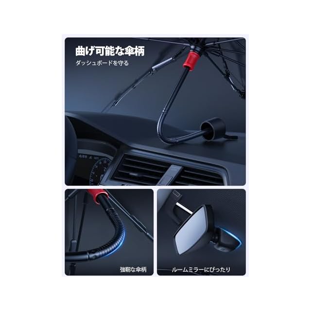 【曲がる可能な傘柄・ダッシュボードを守る】ユニークなデザインが採用されます。ダッシュボードの高低により、傘柄を折り曲げて調整できます。金属の傘柄がダッシュボードに触れないように、その摩擦からダッシュボードが守られます。また、ガラスと接触する四隅にプラスチックの保護カバーがあり、ガラスを傷つけませんのでご安心ください。