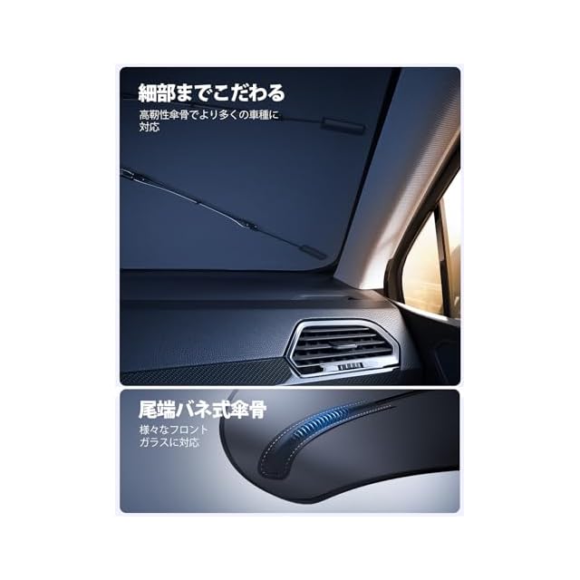【傘骨露出防止・頑丈なガラス繊維製傘骨】各傘骨の末端に露出防止のバネ内蔵デザインにより、車の内装に傷つける心配はありません。傘骨は強さ、耐熱性、耐食性のバランスが完璧なガラス繊維が採用され、耐用性が優れます。