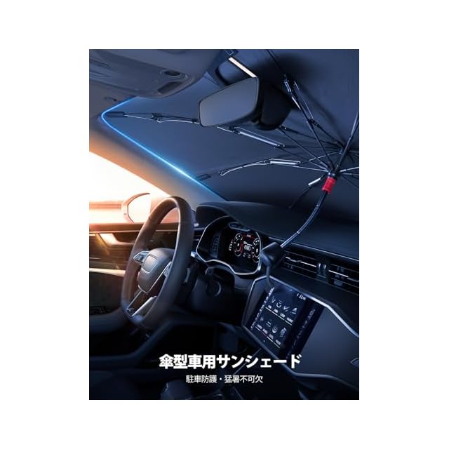 【猛暑対策・遮光断熱】夏には、紫外線を防ぎ、車内の温度を下げることを目指します。フロントサンシェードにより、紫外線に対するバリアを作ります。約99%以上の紫外線を効果的に遮断しますので、外気温が上昇しても、駐車中の車内を涼しく保ち、ひどい暑さを防げます。蒸し暑い車の環境に悩まされることはなくなります。 内装劣化防止、ダメージや経年劣化を防ぎます。駐車時の大事な車を太陽光による損傷やハンドル焼け、ダッシュボードなどの樹脂部分の日焼けからしっかりご愛車を守ります。駐車の度に気持ちをより涼しくしてくれます。