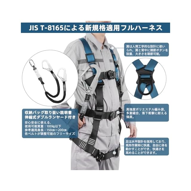 高品質素材 ハーネス 安全帯 新規格 セット: 使用可能質量:100kg以下、ショックアブゾーバ種別: 第一種(4kN)、最大自由落下距離: 1.8m