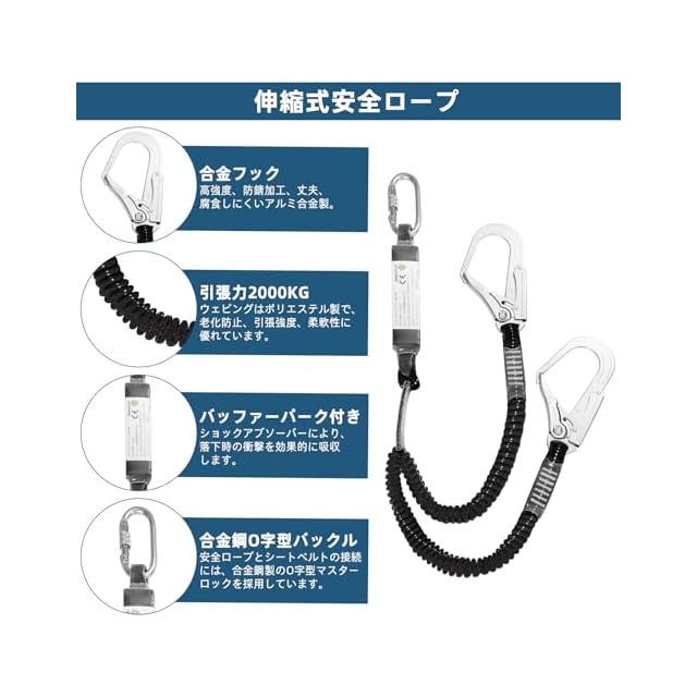 調整可能なフルハーネス 新規格 :当社のハーネス安全帯は、ユーザーが重量内で適切にフィットするように 6 点の調整を提供します。ショックアブソーバーはついていますので、一旦落下時墜落時、ハーネスは衝撃を体全体に分散し、人体への負担を軽減します。フルハーネス安全帯 新規格 セットは、安全で快適、着やすく、あらゆる体格の方に適しています