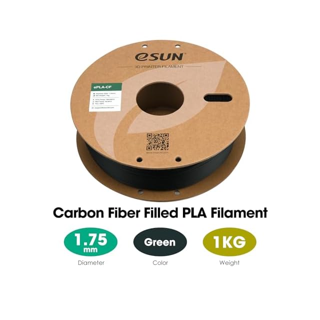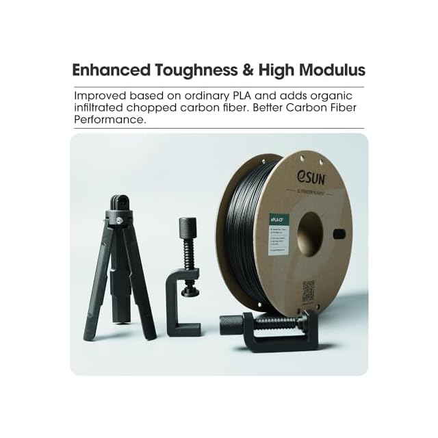 【炭素繊維強化PLA】:eSUN ePLA-CFフィラメントは、強度と弾性率を向上させるために炭素繊維を添加しています。PLAをベースに、有機浸透処理された短繊維の炭素繊維を添加することで、より優れた性能と高い曲げ弾性率を提供します