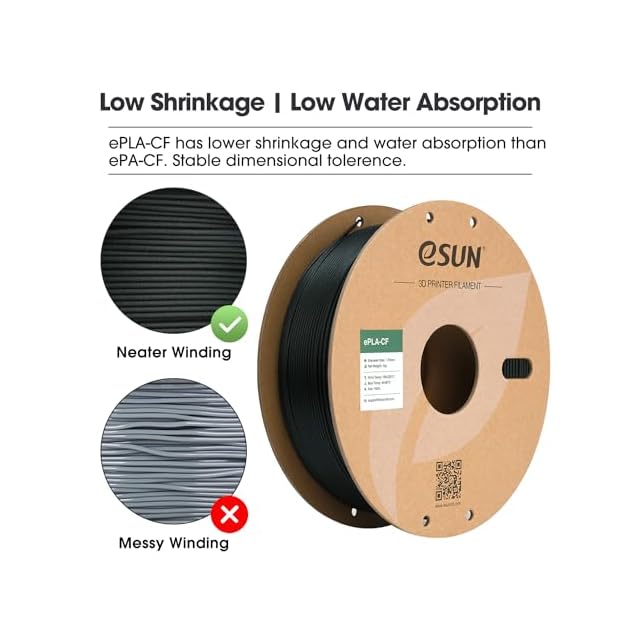 【印刷性能が良く、収縮が少ない】:eSUN ePLA-CFフィラメントは、ePA-CFよりも低い収縮率と水吸収率を設計しています。また、良好な丸み、狭い直径許容差、そして巻き取りが良好で、重なりや絡まりがありません。溶けやすく、ノズルやエクストルーダーの詰まりなくスムーズにフィードされるため、高い印刷成功率がされます。