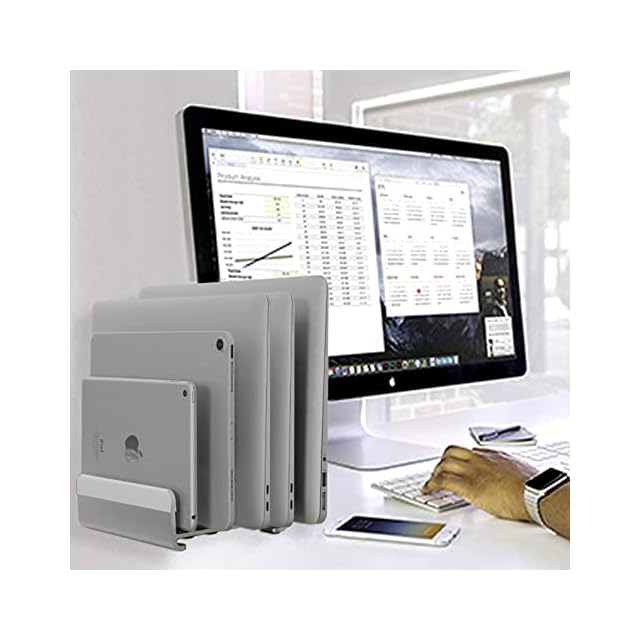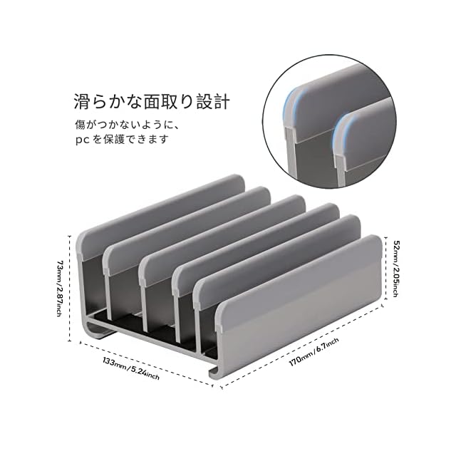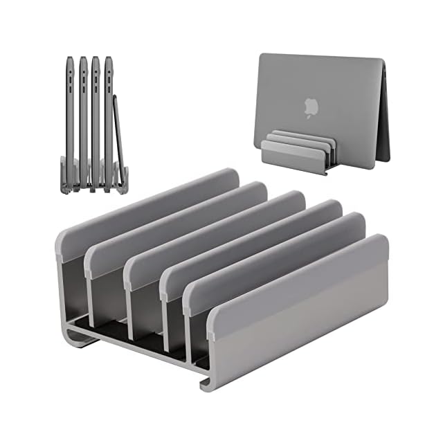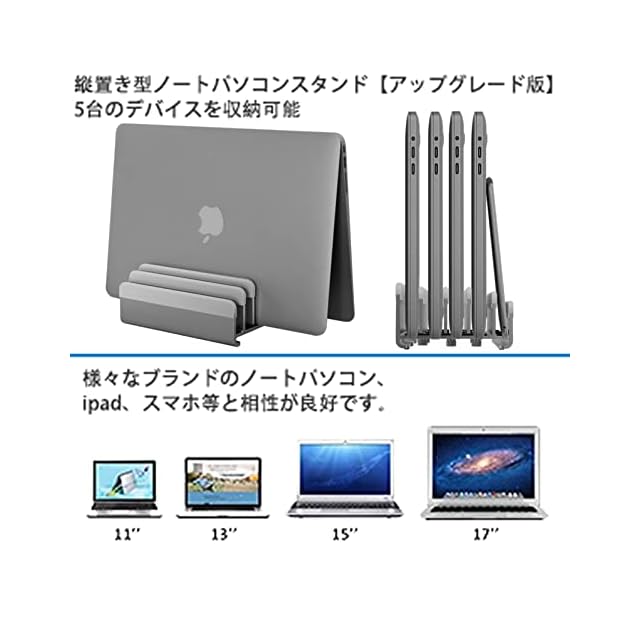 縦置きで最大5台のデバイスを収納できるノートパソコンスタンド。幅は自由に調節可能で、素材のアルミニウムは、様々なブランドのノートパソコン、ipad、スマホ等と相性が良好です。MacBook Pro/Air/Microsoft Surfaceのすべてに対応し、新デザインを採用しています-グレー | つむぎ屋