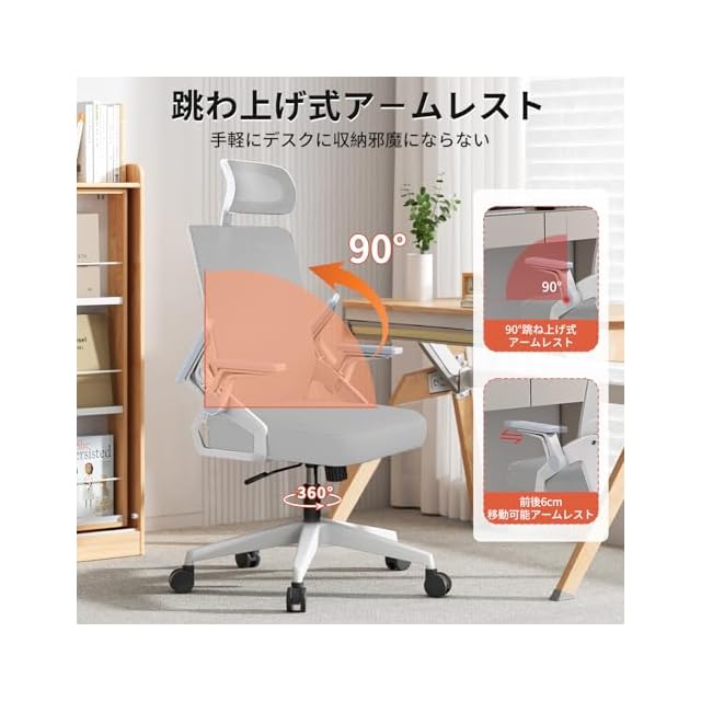【人間工学設計·跳ね上げ式アームレスト】人間工学の概念に基づき、椅子はS型背もたれ設計を採用し、人体の曲線に一致する設計と同時に、全体の力点を有する。背骨をしっかりにサポートできて、座りっぱなしの腰に強い負担をかけず、安心して作業や勉強できます。アームレストは前後6CM調整と90度回転できるように設計されているため、使わないときはアームレストを引き上げて、どのデスクの高さにもすっきりと収納できるので、部屋のスペースを有効に活用できます!部屋、書斎、オフィス、会議室、応接室など幅広く利用可能なデスクチェアです。