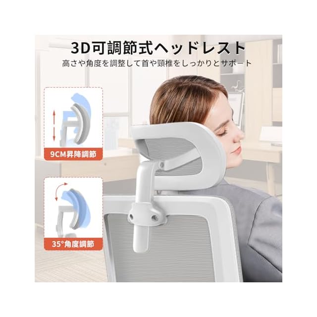 【リラックス背座ロッキング機能が搭載し】 椅子は30度ロッキング機能を搭載し、座面と背もたれが繋がっていているチェアは座面と背もたれが30度角度で同時に可動します。体を動かすことでゆらゆらと揺れている。長時間の仕事や勉強の合間に、リラックスした時間をお過ごし、ちよっと疲れてしまったとの気分転換ができます。角度調整可能な3Dヘッドレストを搭載し、高さは6CM、35°角度を調整でき、自分に適する高さや角度を調整して完全に頭部や首を支えることができき、頭と首の圧力を効果的にかんわします。