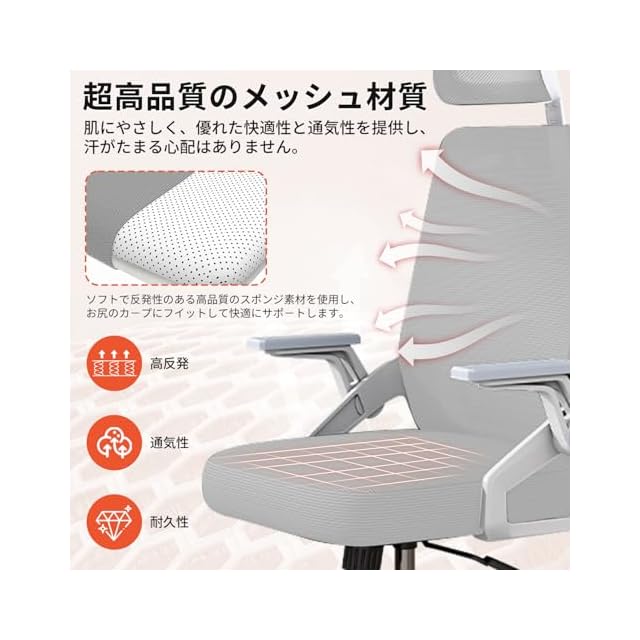【ラテックス座部&通気性抜群のメッシュ生地】クッションは高反発ラテックス製で、柔らかく弾力性があり、通気性と放熱性に優れています。心地よいクッション性があり、リラックス効果が抜群で、ソファのように包み込まれる快適な座り心地が体験できます。背もたれと座面には、通気性の良いメッシュ素材を採用しました。よりよい伸縮性がありメッシュは背中にやさしく、長時間の作業もサポートします。テレワーク用、勉強用、在宅ワーク用、様々な場合で活躍です。