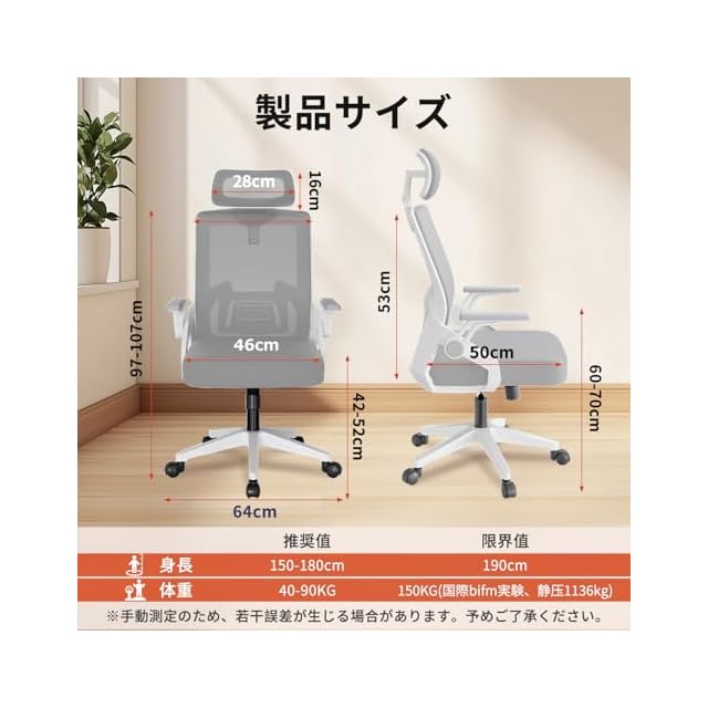 【10分間で簡単に組立可能・品質あり】オフィスチェアのサイズ:幅60×奥行60×高さ107-117cm(座面高:42-52cm)。本体重量は10kgで静止耐荷重は約150KGに達しており、ご安心して利用いただけます。日本語の取り付け説明書と工具が付属しており、痩せた女性でも10分以内に簡単に取り付け可能です。安心:万が一商品到着後、初期不良・破損・取り付け方法が不明等の場合はお気軽にご連絡ください。返品、返金、取り付けるビデオを送させていただきます。