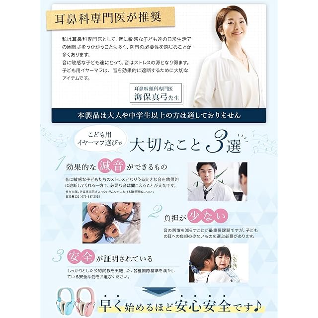 本製品は子供に最適なサイズに設計しているため中学生以上及び成人の方に適しておりません。大人用イヤーマフのご使用を推奨いたします
