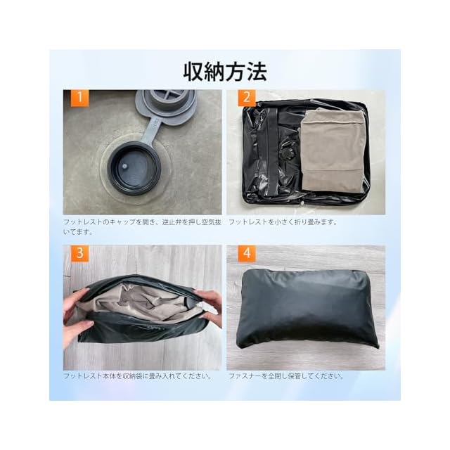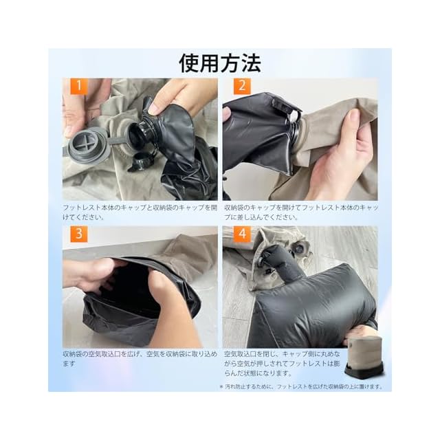 【エアー足枕&空気入れ簡単】収納袋付きの大型空気取込口と大きなキャップにより、空気入れが簡単に完成できます。抜くのも迅速に行えます。空気入れの収納袋を利用するために、音が小さくて衛生的に膨らませます。