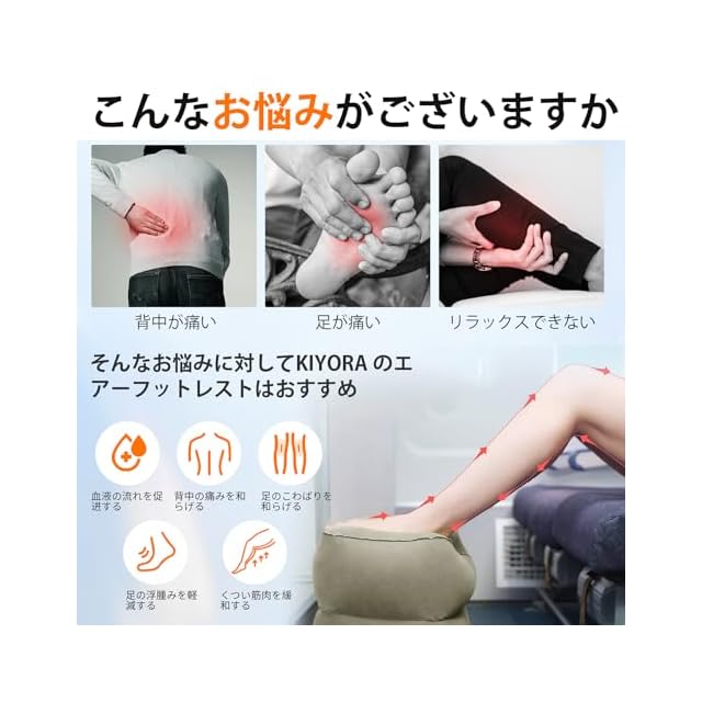KIYORA フットレスト 飛行機 子供 空気 足置き エアーフットレスト 足枕 快適グッズ 車 足元 クッション 三段階 高さ調節 足のむくみ エコノミー症候群 長距離ドライブ 新幹線 夜行バス 家用 オフィス デスク下 収納袋付き 空気入れ3回で完了 (グレー) | つむぎ屋
