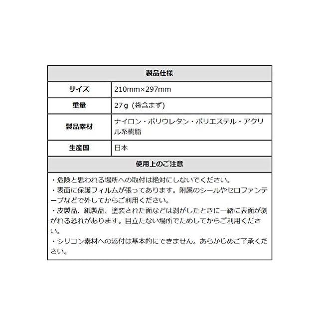 【上手な使い方】・貼り付ける先の素材と形を確認してください。・貼り付ける前にキレイに掃除してください。・貼り付けた後、少し時間をおいてください。・角に少し丸みをつけてください・表面フィルムをはがしてください。