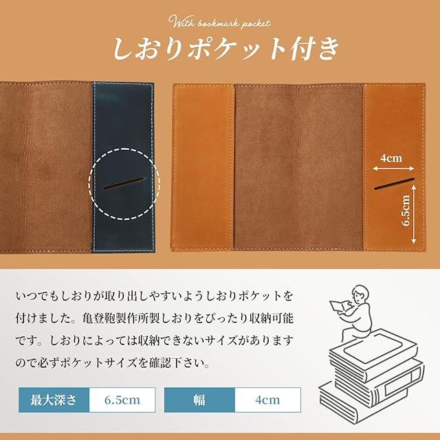 ️【しおりポケット付き】 いつでもしおりが取り出しやすいようしおりポケットを付けました。亀登鞄製作所製しおりをぴったり収納可能です。しおりによっては収納できないサイズがありますので必ずポケットサイズ確認下さい。 しおりポケットサイズ(最大深さ:6.5cm 幅:4cm)