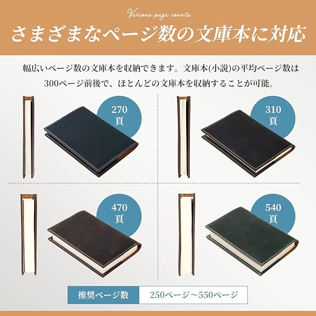 ️【さまざまなページ数の文庫本に対応】 推奨ページ数:250ページ ~ 550ページ 幅広いページ数の文庫本を収納することができます。文庫本(小説)の平均ページ数は300ページ前後で、ほとんどの文庫本を収納することが可能です。 各ページの収納イメージは商品画像をご確認下さい。