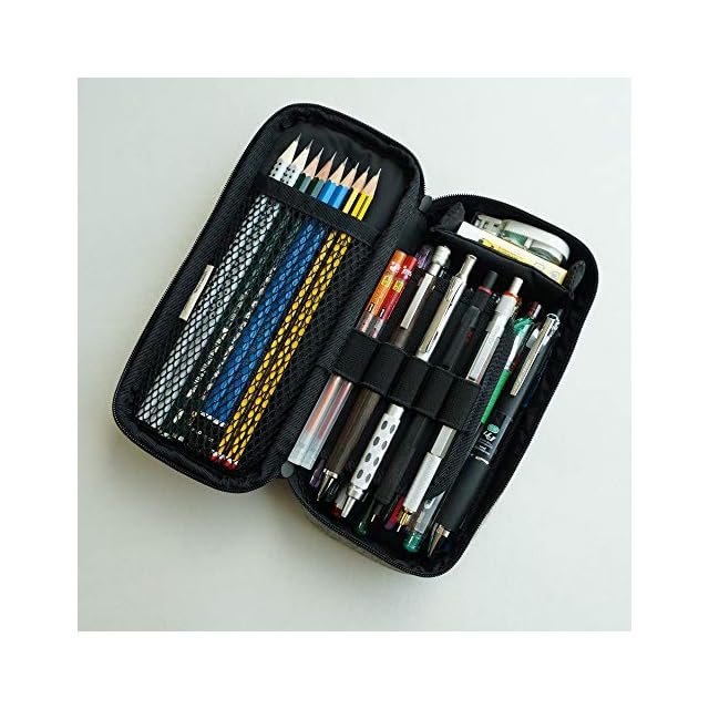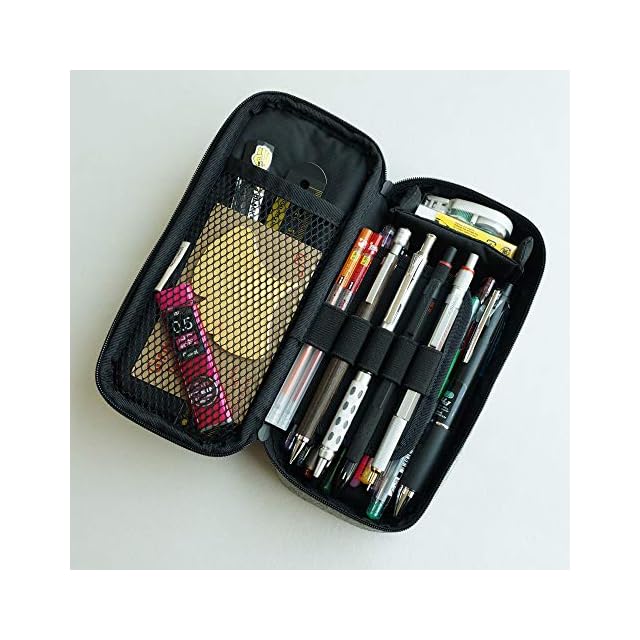 大容量ペンケース、メッシュポケット1箇所・消しゴム用仕切り・5本用ペンホルダー搭載で、筆記具と消しゴムを分けて収納可能、スムーズに取り出せる設計。
