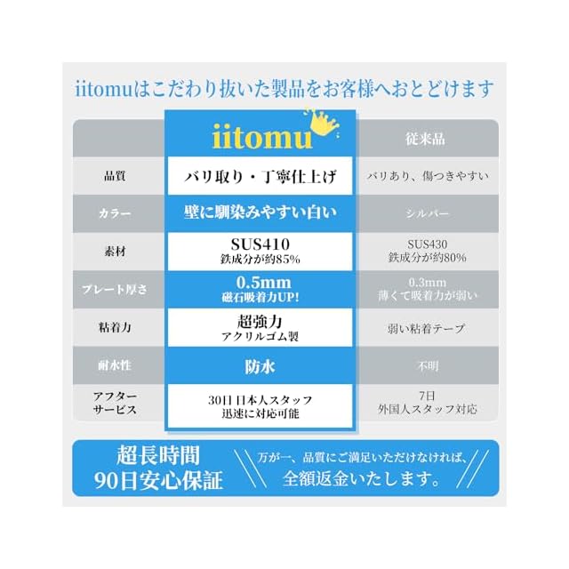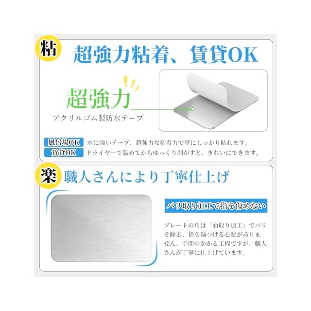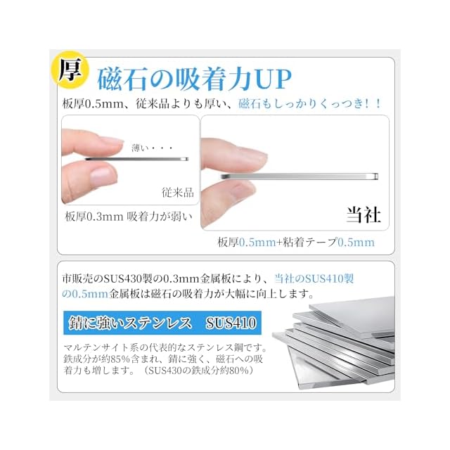 【吸着力UP・超強力粘着】:他社のSUS430より、当社のSUS410製のマグネット補助板は磁石の吸着力が大幅に向上します。アクリルゴム製超強力な透明粘着テープで、落ちることがなく。また、水にも強いため、お風呂場やシンクもOK。*ご使用により発生したのり跡やはがれに関しての補償は出来かねます。