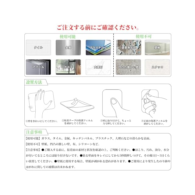 【使用可能】:ガラス、タイル、金属、キッチンパネル、プラスチック、大理石などの滑らかな表面。【使用不可】壁紙、凹凸の激しい壁、布、シリコーンなど。【注意事項】①接着面の素材と状況を確認の上、ご判断ください。②壁面に貼り付けた後、24時間以上放置してから使用してください。