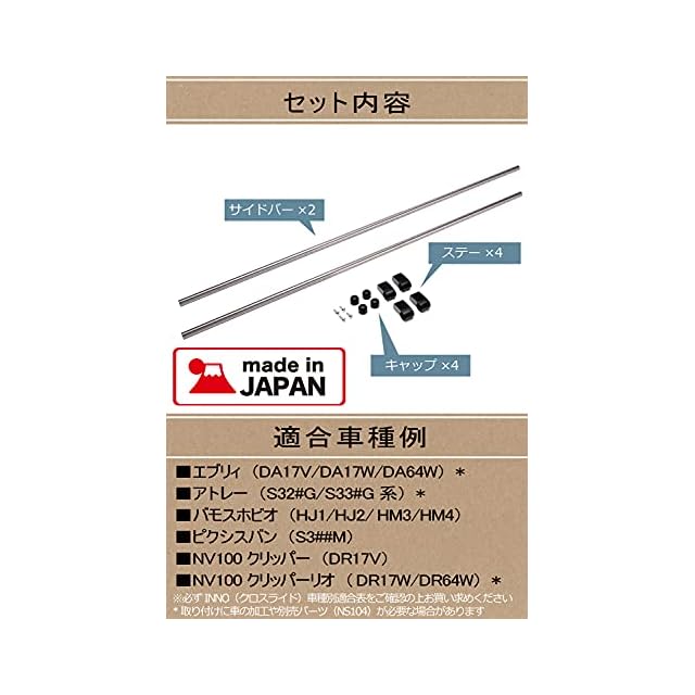 エブリイワゴン(DA64系)・バモス(HM1/2系)はNS103単体では取り付けることができません。必ずNS103とNS104を使用してください。