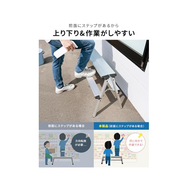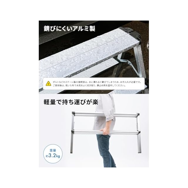 【錆びに強い高品質アルミ製】軽量で持ち運びやすく、錆びに強いアルミ製なので、水回り作業や屋外作業にも安心して使えます。ステップは水が溜まらないよう加工されています。