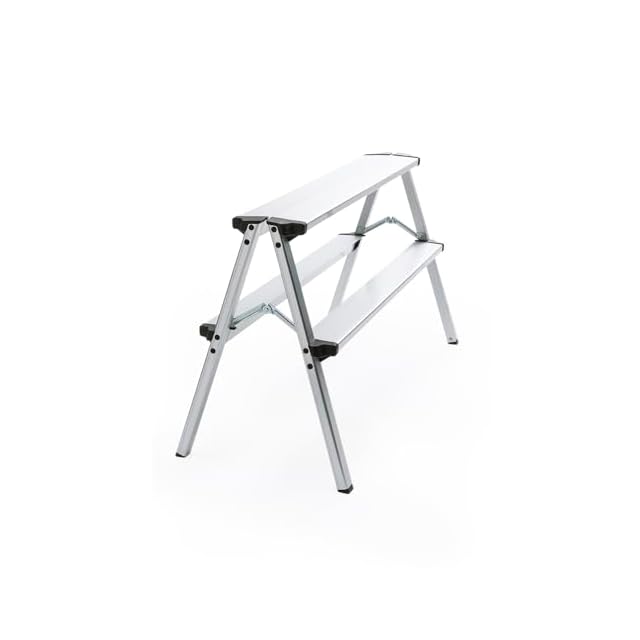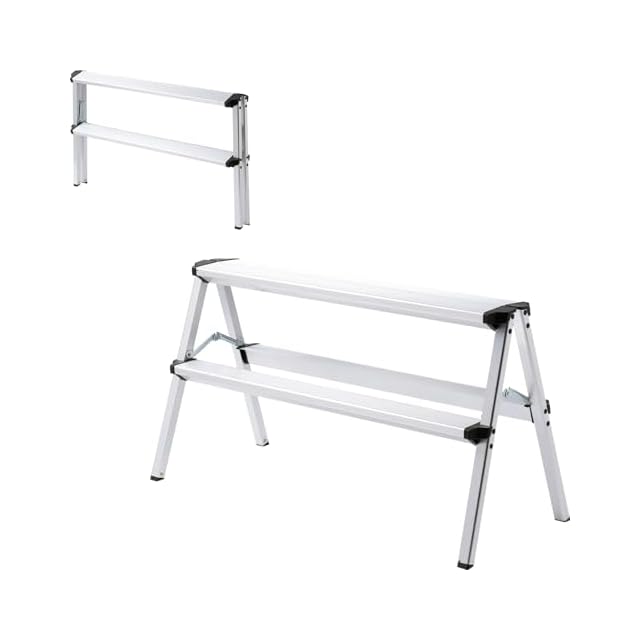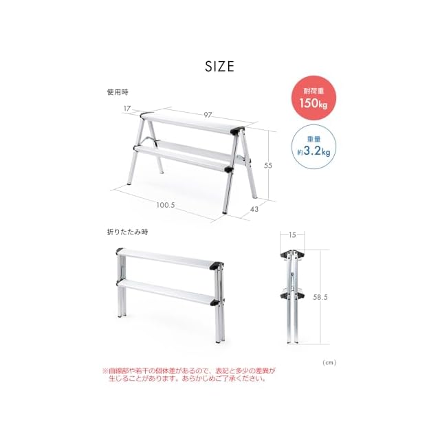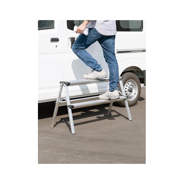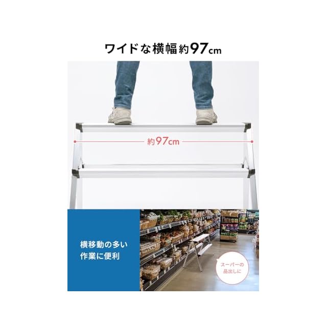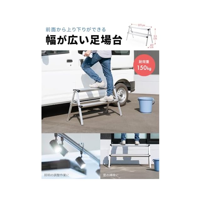 イーサプライ アルミ足場台 洗車台 2段 ワイド 天板97cm×17cm 高さ55cm スリムタイプ 耐荷重150kg 軽量3.2kg 折りたたみ 踏み台 脚立 シルバー EEX-KYA29 | つむぎ屋