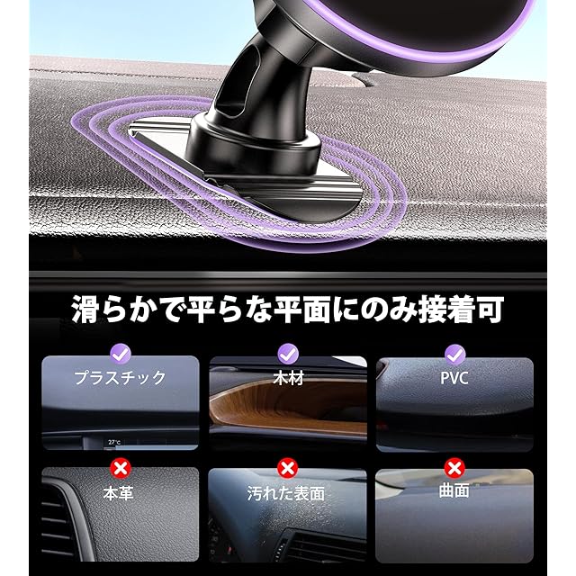 【LEDライト&粘着式ダッシュマウント】電源を接続するとパープルライトが点灯し、夜間に充電位置を見つけやすくなります。スマートフォンを充電するとライトは消え、充電がない場合は10秒後に消灯します。ご注意:付属のオリジナルケーブルをご使用ください。他のケーブルでは接触不良により充電できない場合があります。弊社のマグセーフ充電器はダッシュボードにしっかりと固定できる粘着式マウントで、通気口にプラスチックやガラスのダッシュボードに適しています。